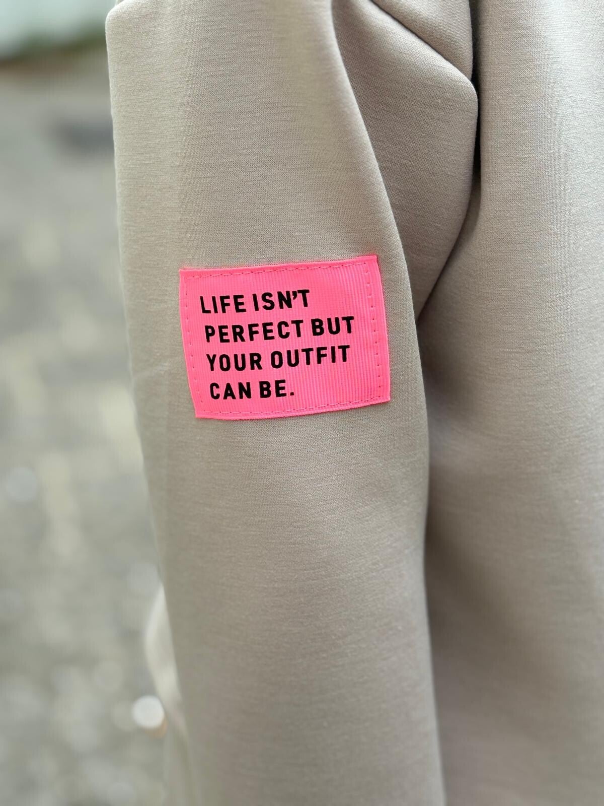 Deze stijlvolle tweedelige set bestaat uit een shirt met lange mouwen en een flared broek. Beide items hebben een stoer roze label met de tekst: "Life isn’t perfect but your outfit can be."