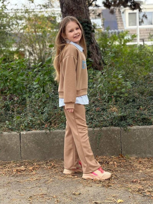 Deze leuke meisjes set combineert comfort met een trendy look! De set bestaat uit een zachte camel-kleurige sweater met het woord LOVE in een frisse print, en een bijpassende broek voor een complete outfit. Dankzij de losse pasvorm en het fijne materiaal is dit pak ideaal voor school, spelen of een dagje uit. De gestreepte blousekraag geeft de outfit een extra stijlvolle touch.