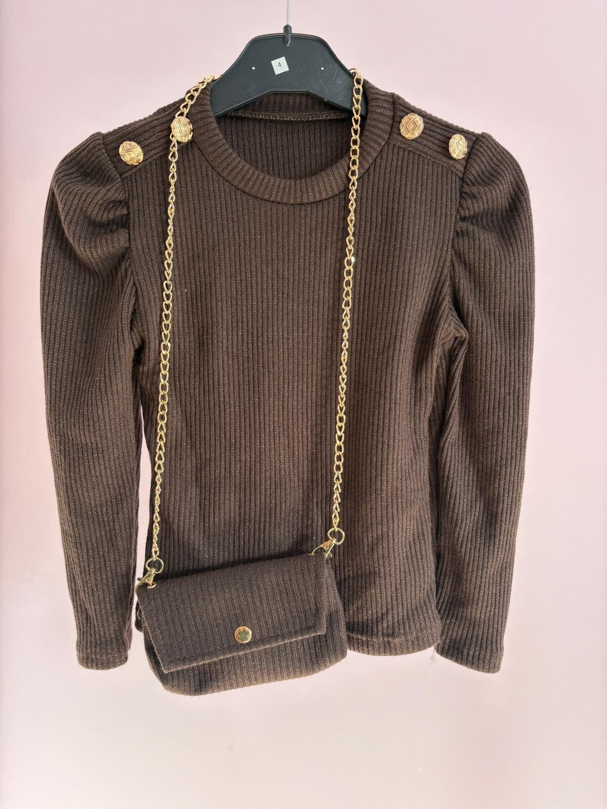 Gebreide Trui met Gouden Knopen & Mini Tas – Verkrijgbaar in Beige en Donkerbruin