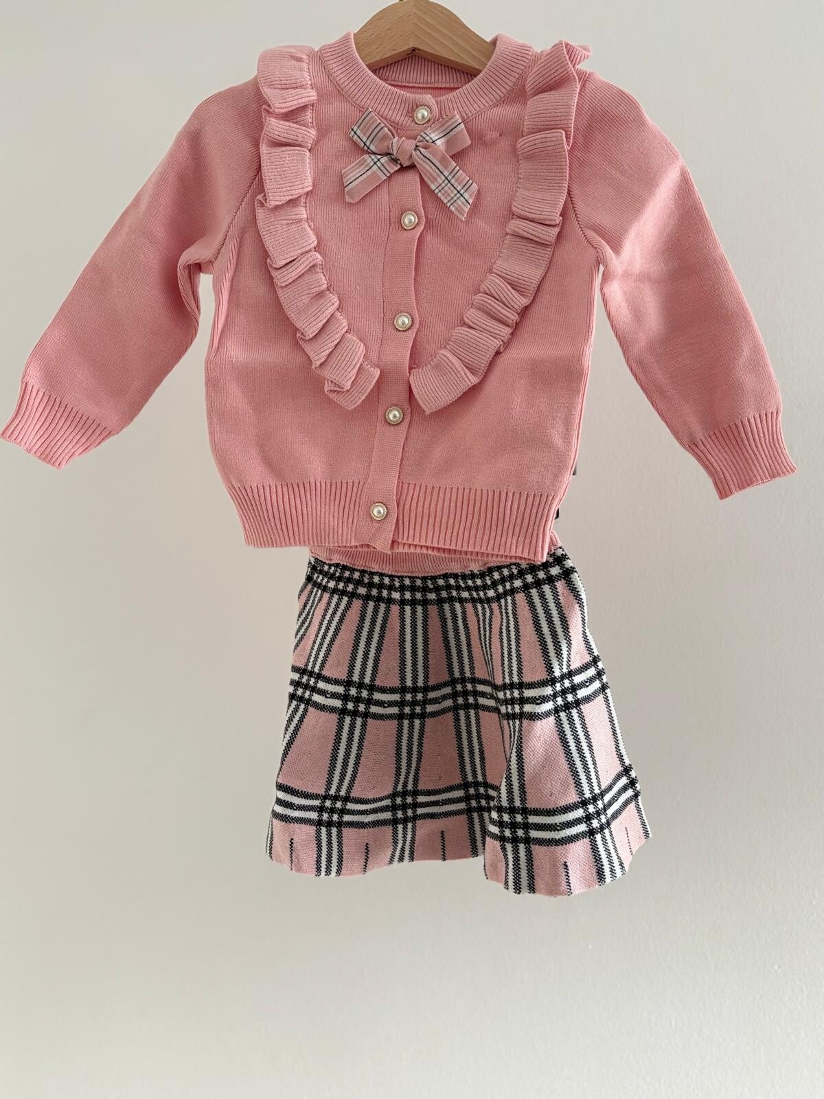 Het zachte vestje met ruches, parelknopen en strikdetail zorgt voor een elegante uitstraling, terwijl de geruite rok met zijn speelse plooien zorgt voor een modieuze en tijdloze look.